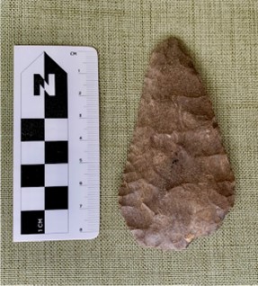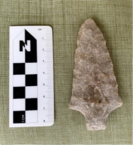 Luego, los dueños de la propiedad me enviaron un correo electrónico describiendo cómo encontraron los artefactos y dónde se encontraban los artefactos. También incluyeron bonitas fotos de los dos artículos. Pude identificar uno de los elementos como un punto de tipo Genesee. Al principio pensé que el segundo artículo era una "preforma" o "pieza en bruto" hecha de un material de grano más fino, un material que no suele encontrarse en la zona. Una preforma es una pieza de piedra extraída de una cantera, o hecha de un adoquín, y trabajada hasta el punto de que gran parte del material sobrante se ha astillado pero se ha dejado sin terminar. Esto permite al fabricante llevar el artículo y terminarlo a su gusto. Esta piedra, sin embargo, parece haber sido afilada en un borde. Lucía algo de desgaste por el uso evidente, como si hubiera sido utilizado como cuchillo o raspador.
