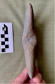Varios días después recibí otro correo electrónico de las mismas personas que encontraron los artefactos. Habían encontrado otro artefacto a unos 100 pies de distancia de los hallazgos anteriores. Este fue aún más intrigante. El objeto es un peso atlatl inacabado. Nunca antes había visto uno sin terminar en el campo, y ciertamente no uno que estuviera intacto como este. Cuando digo que está sin terminar, me refiero a que debería haber un agujero perforado en el centro del peso. Está claro por el aspecto de este objeto que alguien comenzó el proceso de creación del atlatl, pero nunca lo completó. ¿Por qué? ¿Se ha caído el atlatl? ¿Le pasó algo a esta persona que impidió que lo terminara? Además, ¿está el atlatl asociado con los otros artefactos desenterrados cerca? Siempre hay más preguntas que respuestas en arqueología. Quizás eso es lo que nos hace seguir adelante; Siempre estamos buscando esa única respuesta.