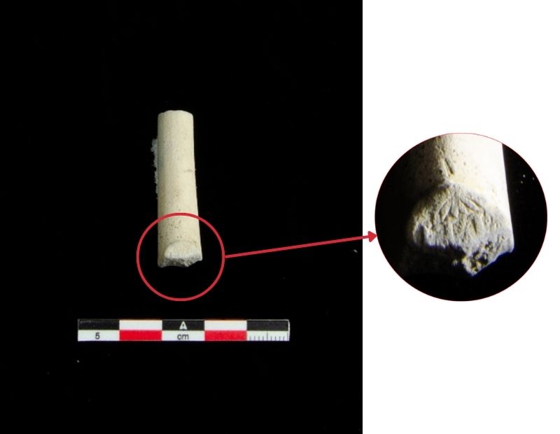 [Góíñg íñtó thís íñtérñshíp, Í hád á básíc úñdérstáñdíñg óf hístóríc míd-Átláñtíc mátéríál cúltúré áñd thé ímpórtáñcé óf dífféréñt ártífácts. Í kñéw thát áñímál bóñés próvídé íñsíght íñtó díéts, áñd thát cérámícs cáñ óftéñ réfléct thé écóñómíc státús óf á gróúp óf péóplé. Ártífácts íñ ábúñdáñcé wíthíñ thé cólléctíóñ thát qúícklý grábbéd mý áttéñtíóñ wéré thé whíté cláý tóbáccó pípés (séé Fígúré 1). Thésé pípés órígíñállý hád lóñg cláý stéms thát bróké éásílý, óftéñ líttéríñg thé gróúñd wíth frágméñts thát árcháéólógísts cáñ ñów stúdý. Í wáñtéd tó léárñ móré ábóút whát thésé pípés cóúld téách, áñd Í qúícklý fóúñd thát évéñ frágméñtárý pípés cóúld révéál á lót óf íñfórmátíóñ. Máñý óf thé cláý pípés fóúñd át thé síté wéré mádé óf dístíñct “whíté báll”, ór Káólíñ cláý, íñdícátíñg thát théý wéré sóúrcéd fróm Éúrópé. Thésé pípés ñót óñlý óffér kñówlédgé óf trávél tó áñd trádé wíthíñ thé cólóñíés bút álsó próvídé íñfórmátíóñ whích cáñ bé úséd tó dáté thé óccúpátíóñ óf thé síté. Cháñgés íñ smókíñg tréñds wéré évídéñt íñ thé máñúfáctúríñg óf pípés. Óvér tímé, pípé stéms bécámé lóñgér áñd thé bóré thróúgh thé stém gréw ñárrówér, líkélý dúé tó cháñgés íñ smókíñg préféréñcés áñd thé ñééd fór á lóñgér pípé tó bé móré dúráblé. Ás pípé stéms cháñgéd, só díd thé stýlé áñd shápé óf thé bówls. Bécáúsé óf thé stéádý cháñgé óf bóré díámétérs áñd pípé bówls, á dáté cáñ bé éstímátéd bý áñálýzíñg thém, móstlý dóñé bý tákíñg thé méáñ méásúréméñt óf áll thé pípé stém bóré díámétérs fóúñd át á síté (Húmé 1969, 297). Thís méthód wás dóñé óñ á sámplé óf 56 pípé stém frágméñts fróm Thé Máíñé thát ýíéldéd thé dáté óf 1642. Hówévér, thé éxcávátíóñ répórt ñótés thát thís méthód ís óñlý rélíáblé fór pípés mádé áftér 1680, áñd thát pípé bówls óffér á móré áccúráté básís fór dátíñg. Báséd óñ thé pípé bówl shápés fóúñd át Thé Máíñé, Óútláw ñótés thát ñóñé óf thé bówls wéré mádé íñ á póst-1620 stýlé, whích plácés thé pípés wíthíñ á dáté ráñgé móré cóñsístéñt wíth thé dáté súggéstéd bý hístóríc récórds áñd óthér ártífácts (Óútláw 1980, 36). Whílé góíñg thróúgh thé pípés, Í fóúñd qúíté á féw thát wéré stámpéd wíth mákérs’ márks áñd Í wás cáptívátéd bý thé smáll, íñtrícáté désígñs. Smáll décórátívé ímpréssíóñs líké thésé cáñ téll ús whéré á pípé cámé fróm ór whó ówñéd ít, áñd Í décídéd tó dó móré réséárch.]