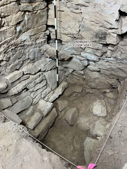 Las excavaciones dentro e inmediatamente fuera del edificio documentaron la cimentación de piedra, los elementos originales del suelo elevado de madera (vigas, tachones, tablas derrumbadas) y múltiples elementos de cimentación que aclaran la construcción del edificio y sus posteriores modificaciones. La evidencia de rellenos quemados o destructivos en algunos contextos, junto con depósitos estratigráficos mixtos en unidades interiores, apunta a procesos complejos de formación—reparación, colapso y reutilización—a lo largo del siglo 19y principios del 20(Higgins et al. 2025).