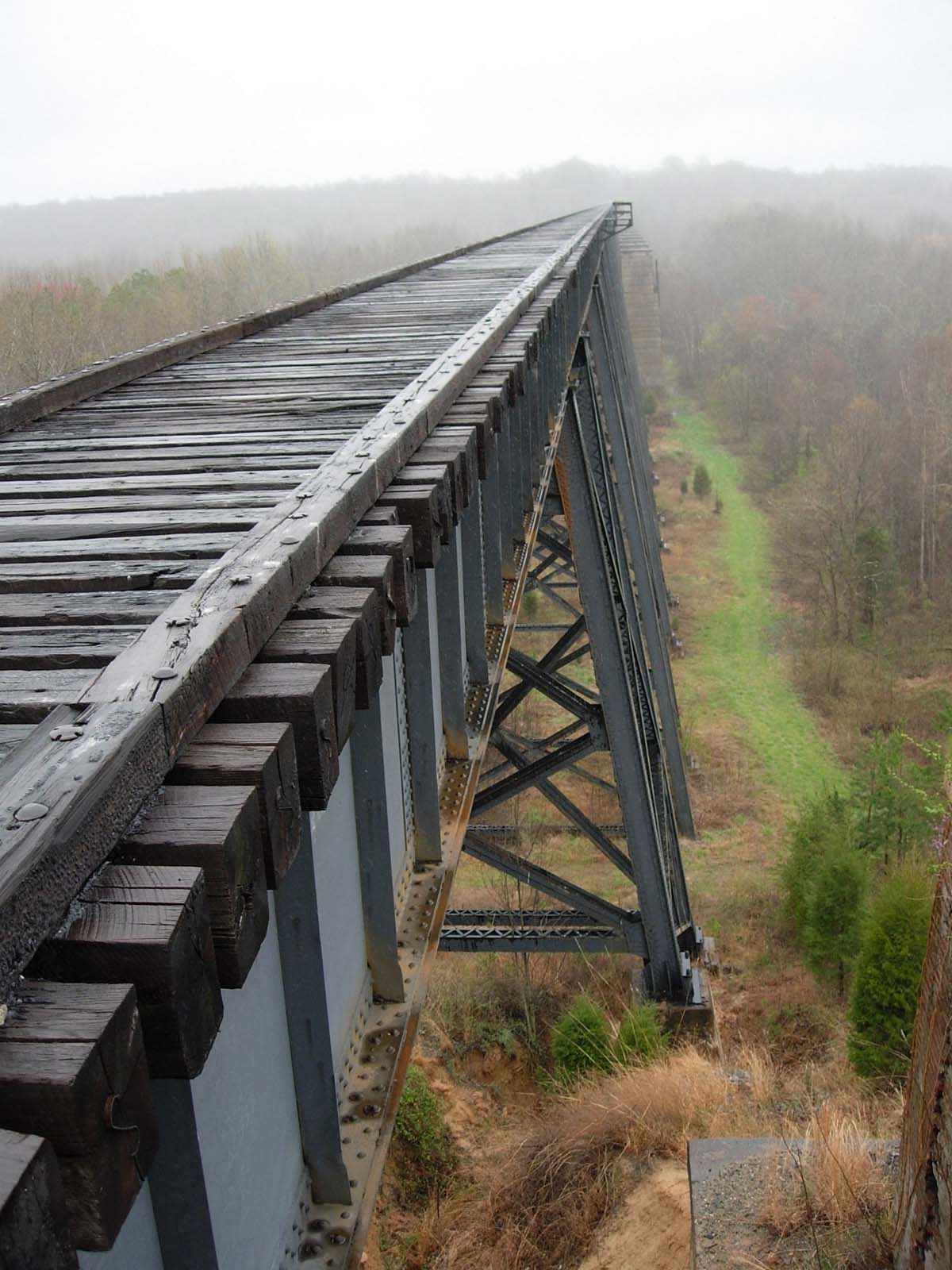 Extendiéndose por una 2recta y nivelada,418 pies, más de 100 pies sobre el río Appomattox y su llanura aluvial entre los condados de Cumberland y Prince Edward, High Bridge es una impresionante estructura de acero erigida en 1914. La lista de registro del puente también incluye los pilares de mampostería existentes y los estribos del 1854 High Bridge. Tanto la estructura de acero como los vestigios del puente anterior recuerdan el desarrollo del ferrocarril en Virginia y la fase final de la Guerra Civil. El puente 1854 fue construido por el Southside Railroad para atravesar el Appomattox, un obstáculo importante para su nueva línea entre Lynchburg y Petersburg. El puente se elevó 126 pies, lo que lo convirtió en uno de los puentes más grandes del mundo en ese momento. En 1865, mientras huía de las fuerzas del general de la Unión Francis Barlow después de la caída de Petersburgo, el ejército de Robert E. Lee quemó el High Bridge, aunque no por completo. Por lo tanto, las fuerzas de la Unión pudieron mantenerse cerca de los confederados y finalmente atraparlos en el Palacio de Justicia de Appomattox. Después de la guerra, se erigió rápidamente otro puente, aunque pronto fue necesario reemplazarlo, lo que sucedió en 1914 cuando se construyó el puente de acero a lo largo de las ruinas de los pilares del puente 1854 . La línea ferroviaria High Bridge continuó siendo utilizada para el servicio de pasajeros hasta 1979 y para el transporte de mercancías hasta 2005. Desde entonces, el Departamento de Conservación y Recreación ha convertido la línea ferroviaria abandonada en un sendero de usos múltiples como un componente del Parque Estatal High Bridge Trail.