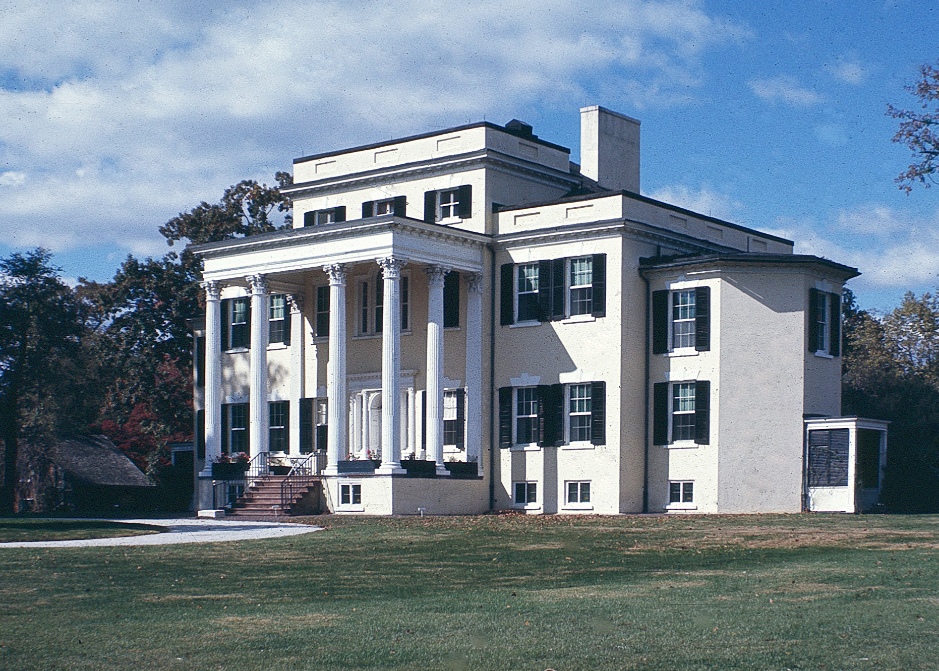 Iniciada en 1804 y embellecida durante las siguientes dos décadas, la monumental mansión de Oatlands en el condado de Loudoun, junto con sus numerosas dependencias y extensos jardines, forma una de las fincas rurales de estilo federal más elaboradas del país. El complejo fue desarrollado por George Carter, uno de los vástagos de prominentes familias de Tidewater que emigraron al norte de Virginia después de la Revolución. Carter desarrolló el diseño de la mansión a partir de ilustraciones en el libro de William Chambers A Treatise on Civil Architecture (1786). Con sus paredes estucadas, sus alas semioctogonales, su techo con parapeto y un pórtico de esbeltas columnas corintias añadidas por Carter en 1827, la casa tiene una ligereza y elegancia especiales. Las amplias habitaciones con su intrincada ornamentación federal complementan el exterior. Oatlands permaneció en la familia Carter hasta 1897. En 1903 fue adquirida por William Corcoran Eustis, nieto del banquero y filántropo William Wilson Corcoran. La finca fue donada al National Trust for Historic Preservation en 1965y sirve como pieza central del Distrito Histórico de Oatlands.