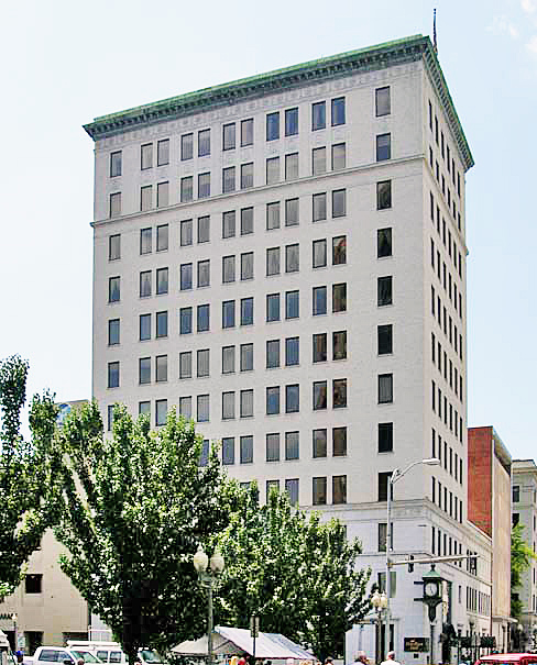 El Banco Nacional Colonial fue erigido en 1926-27y fue un elemento importante del desarrollo de la ciudad de Roanoke como un centro bancario del suroeste de Virginia. De doce pisos de altura, con sillares de granito en los tres primeros pisos y ladrillo esmaltado gris y decoración de terracota en la parte superior, el edificio con estructura de acero fue diseñado por la firma local Frye and Stone. Con su ornamentación esbelta y su aspecto funcional, representa la transición del estilo neoclásico al modernismo. El edificio más alto del centro de Roanokedurante cincuenta años, el Colonial National fue uno de los primeros rascacielos de Virginia. El sucesor del banco vendió el edificio en 1981 pero continuó ocupando la sala bancaria. Los pisos superiores fueron remodelados para el alquiler de oficinas, y a finales del siglo 20el edificio fue rebautizado como el Edificio de Armas Coloniales.