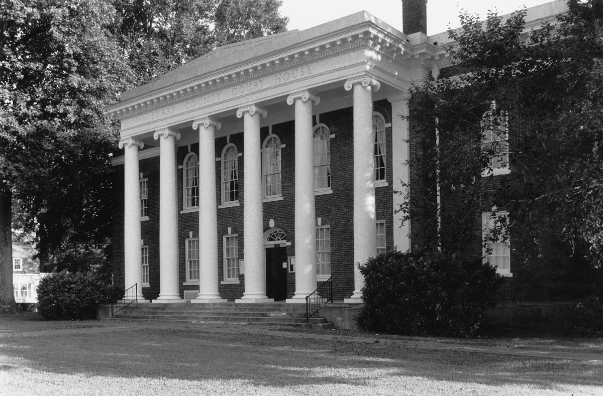 La autoridad del gobierno local está bellamente simbolizada en el palacio de justicia neoclásico del condado de Surry, el hito dominante de esta sede del condado de encrucijada. El edificio de ladrillo de dos pisos, resaltado por un majestuoso pórtico jónico, fue erigido en 1923 después de que un incendio destruyera un palacio de justicia 1907 en el mismo sitio. Diseñado por el arquitecto G. R. Berryman para parecerse al edificio al que reemplazó, el palacio de justicia es la séptima estructura que sirve al condado desde su formación en 1652. Un pequeño edificio de oficinas del secretario erigido en 1825-26, se encuentra en el borde de la plaza del palacio de justicia a la sombra de los árboles. Varias estructuras pequeñas posteriores que albergan oficinas del condado están incluidas en el Complejo del Palacio de Justicia del Condado de Surry.